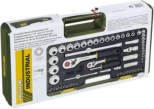 Proxxon 23286 Steckschlüsselsatz Komplettsatz mit 6,3mm (1/4') und 12,5mm (1/2') Umschaltratsche 65teiliges Werkzeug-Set mit Kunststoffkoffer