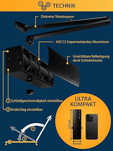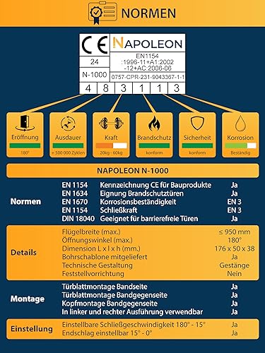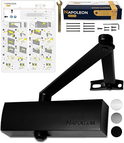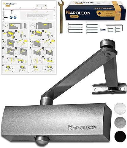 NAPOLEON N-1000 Robuster Automatischer Türschließer - Normen EN1154/EN1634 - Kommerziell & Residential - Türen von 20Kg bis 60Kg Größe 3 - Bohrschablone - Einfache und Schnelle Montage (Silber)