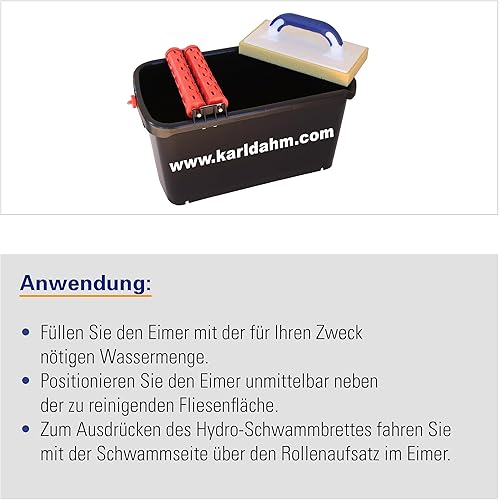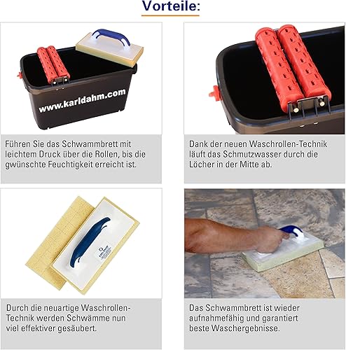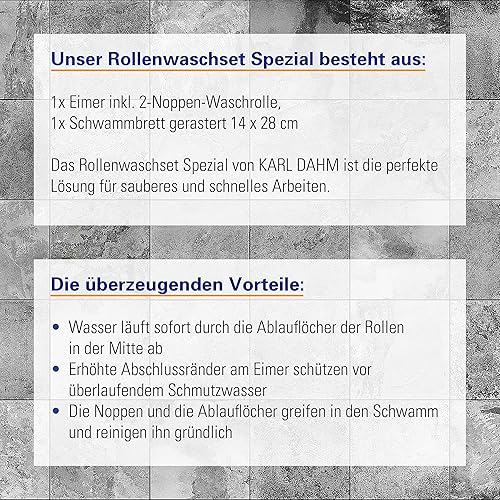 Karl Dahm® Waschset Spezial für Fliesen I Fliesenleger Werkzeug mit 23 Liter Eimer inkl. 2 Noppen-Waschrolle & Schwammbrett gerastert 12 x 28cm – 11433