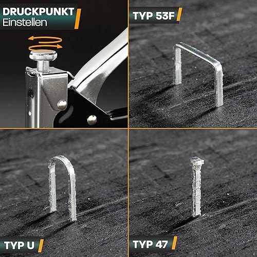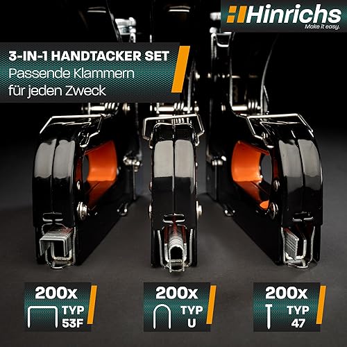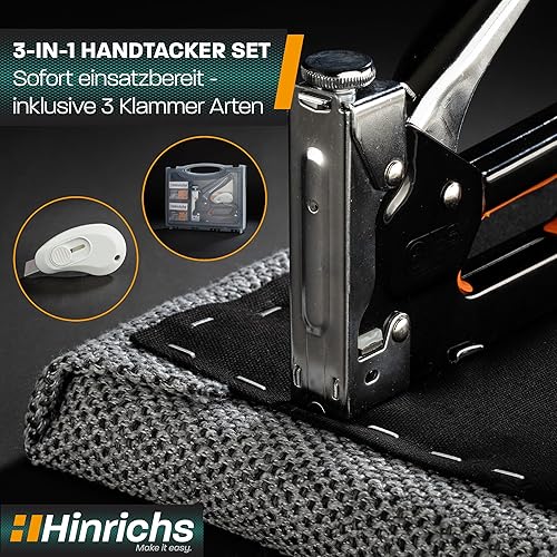 Hinrichs Handtacker Set - 3-in-1 Profi Tacker für Holz - Stofftacker Handwerker zum Fixieren - mit Klammern - Möbeltacker - Staple Gun - Holztacker mit 400 Klammern & 200 Nägeln
