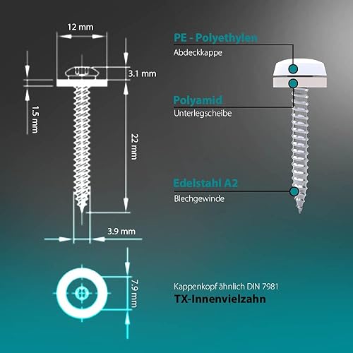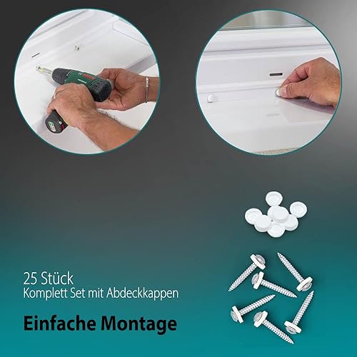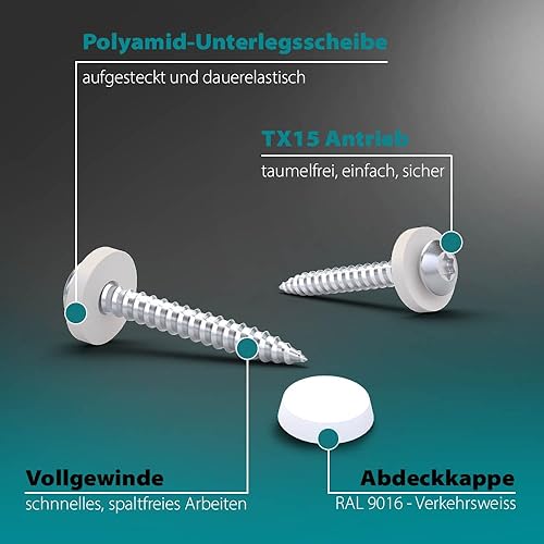 VOOXA Premium Fensterbankschrauben 3,9 x 22mm TX15 Edelstahl A2 mit Polyamidscheibe und Abdeckkappen Weiß RAL9016, für Alu und Kunststoff Fensterrahmen, 50 Stück