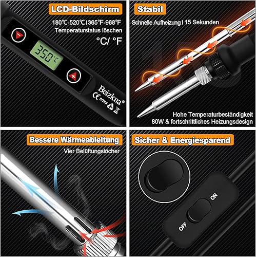 Lötkolben Set 80W LCD Einstellbar Temperatur 180-520°C Lötkolben mit Ein/Aus Schalter, 50g Lötdraht, 5 Lötspitzen, Entlötpumpe, Lötkolbenständer, Pinzette, Lötset für Elektrische Arbeiten