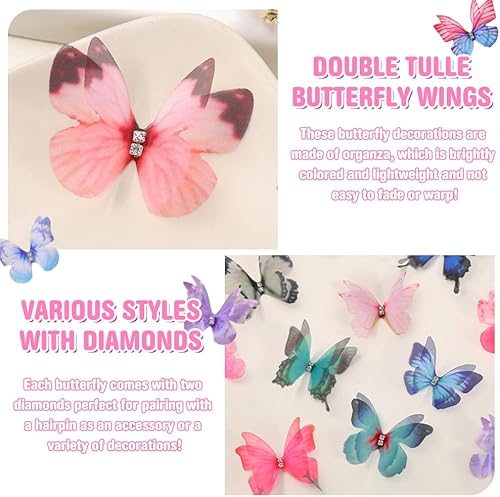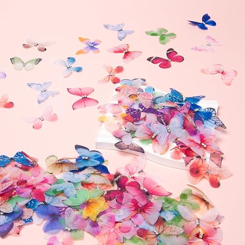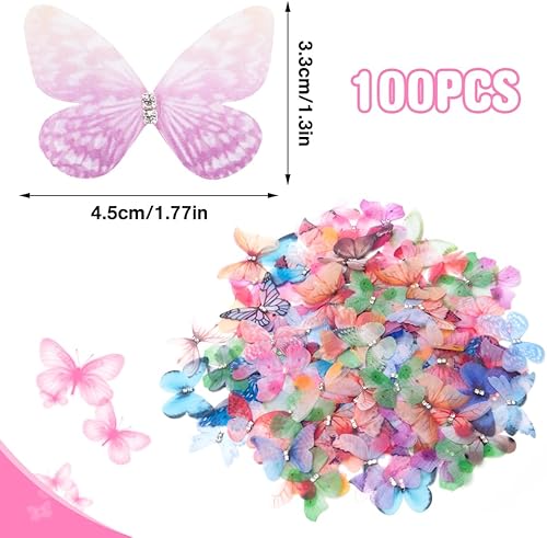 Keboyoe 100 Stück 3D Schmetterlinge Organza mit Strasss Doppellagiger Organza Stoff Schmetterling 4.5cm 3D Schmetterlinge Deko Für Wanddekoration, Kleidung Applikationen, Haarspangen, DIY Dekoration