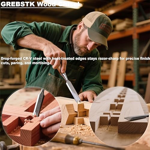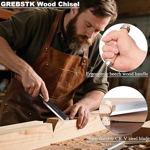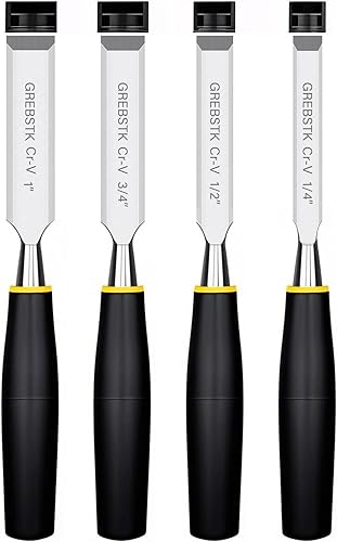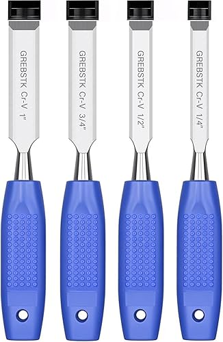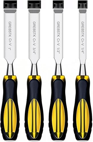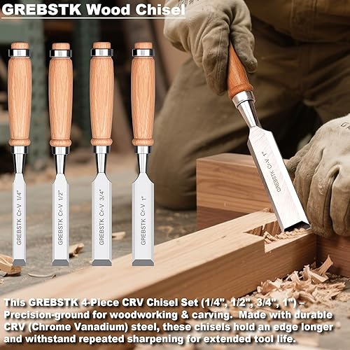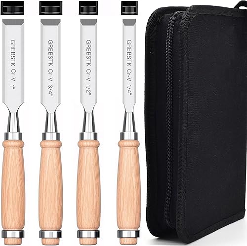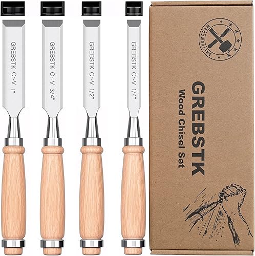 GREBSTK Holz Meißel Set für Holzbearbeitung, 4 tlg. Chrom Vanadium Stahl Schräge Kante Bank Meißel mit Kappe, bequemer Buche High Impact Griff