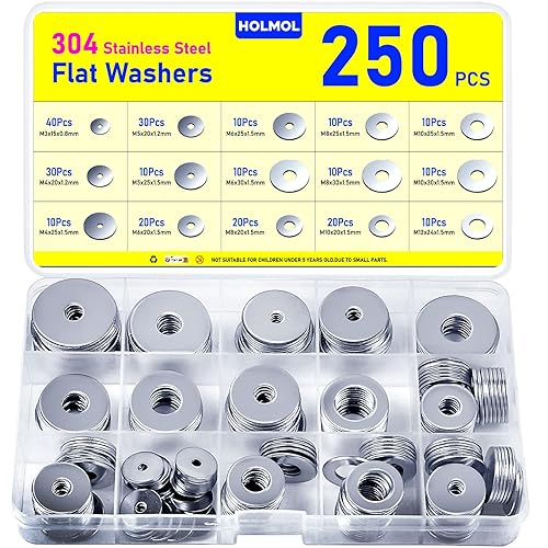 HOLMOL Unterlegscheiben Set 250 Stück, Karosseriescheiben 15 Größen, Edelstahl Beilagscheiben Sortiment M3 M4 M5 M6 M8 M10 M12, Flach Unterlegscheiben Edelstahl, Beilagscheiben Set für Schrauben