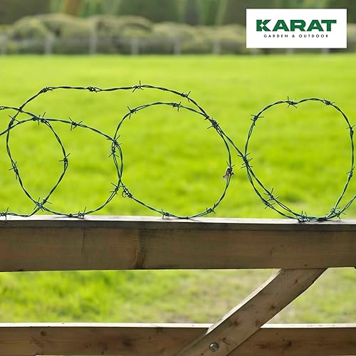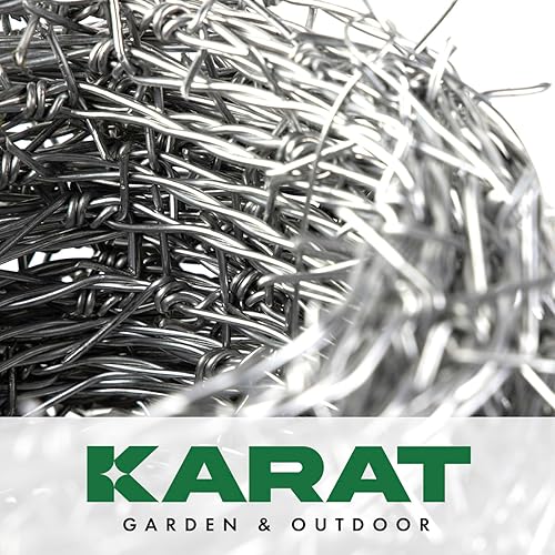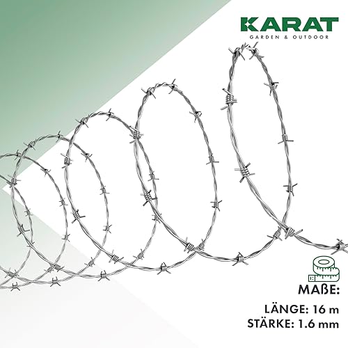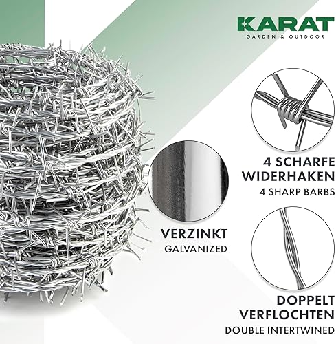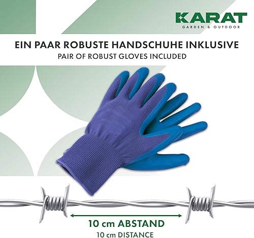 KARAT Stacheldraht verzinkt, 16 Meter Rolle mit Tragegriff und Handschuhe, Übersteigschutz für Zaun, Drahtzaun, Weidezaun, Wildzaun, Abwehr gegen Marder