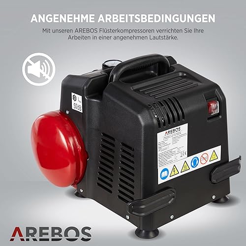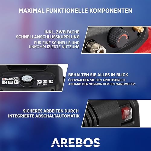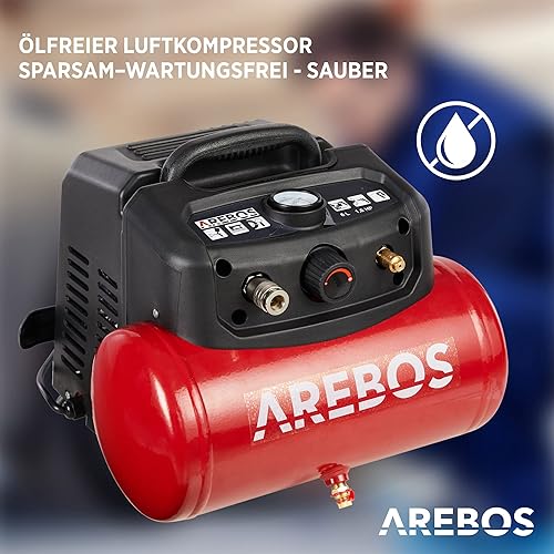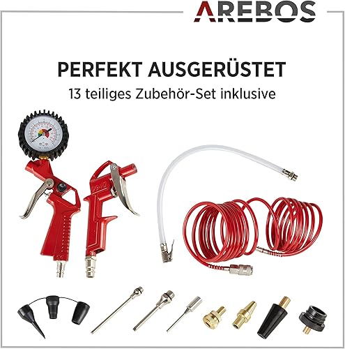 Arebos 6L Druckluftkompressor Kompressor 1200W 8 bar 180 l/min Ansaugleistung | inkl. 13-tlg. Druckluft-Werkzeug-Set | Abschaltautomatik | Extra langer Luftschlauch | ölfrei | Luftkompressor 8 bar