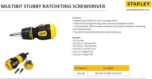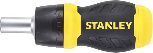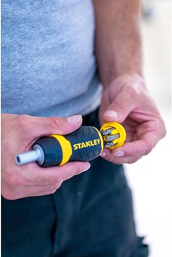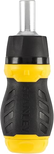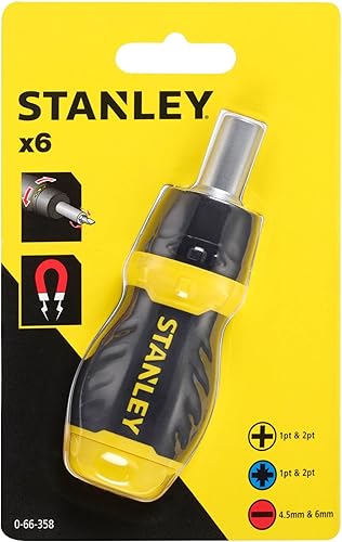 Stanley Bit-Schraubendreher Stubby (mit Ratsche, kurze Ausführung, sechs Bits, PZ1/2;PH1/2;SL4/5/6, magnetische Spitze) 0-66-358