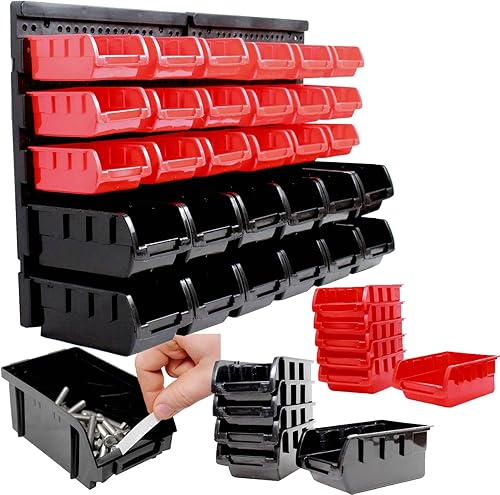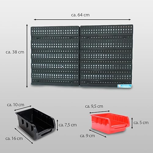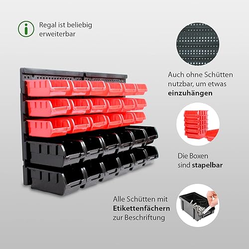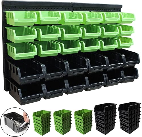 TRUTZHOLM Stapelboxen mit Wandregal 32 TLG Kleinteilemagazin Schütten mit Etikettenfach (grün)