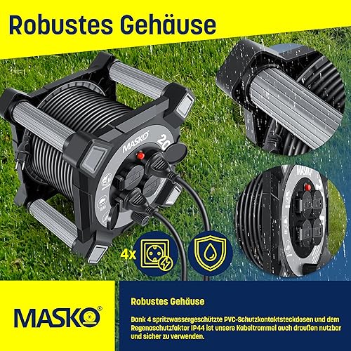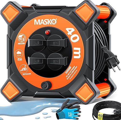 MASKO® Kabeltrommel 40m | Verlängerungskabel mit Schutzkontaktsteckdosen & Wickelgriff | Outdoor Kabelaufroller Thermoschutz | Gerätetrommel IP44 1000W ~ 3000W | inkl. Tragegriff und Montagehandschuhe