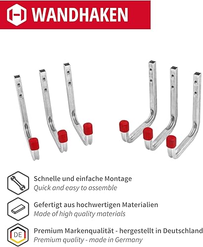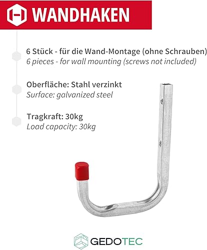 Gedotec Wandhaken Werkzeug Gerätehalter Werkstatt & Garage zum anschrauben | Schwerlast-Metallhaken 80 x 120 mm | Gerätehalter Wand-Montage | Haken Tragkraft 30 kg | 6 Stück - Montagehaken-Set
