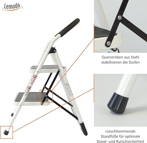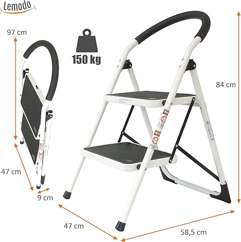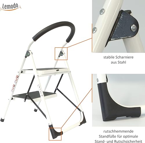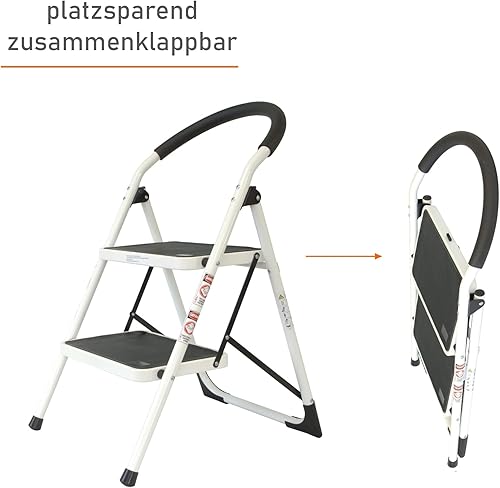 Stahl Klapptritt zusammenklappbar | 2 extra breite Stufen mit Anti-Rutsch-Matten | 84 cm Höhe | Trittleiter mit Klappsicherung | mit rutschfesten Füßen | belastbar bis 150 kg | Haushaltsleiter