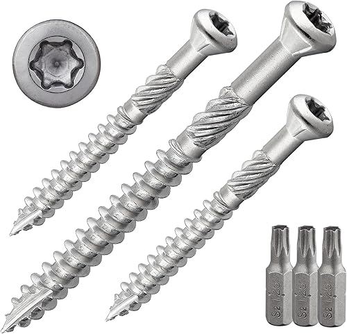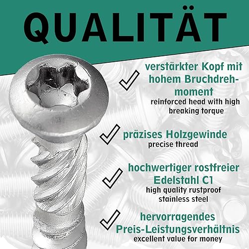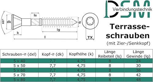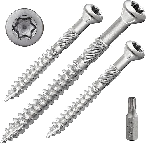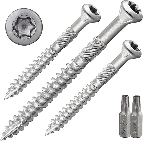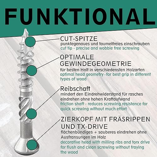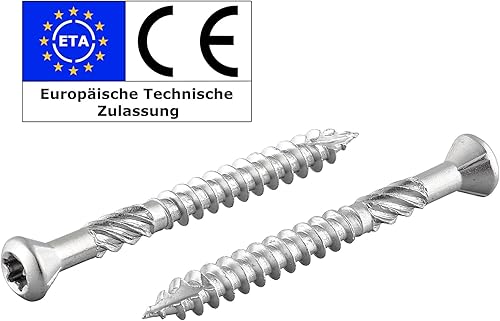 Terrassenschraube mit Zierkopf und TX-Antrieb | gehärteter Edelstahl C1 | inkl. 2 x S2-Bits | Schaftfräser + Cutspitze | unterkopfverstärkt mit Fräsrippen | mit ETA-Zulassung | 5 x 70 mm, 400 Stück