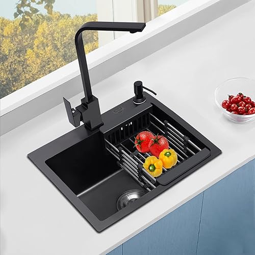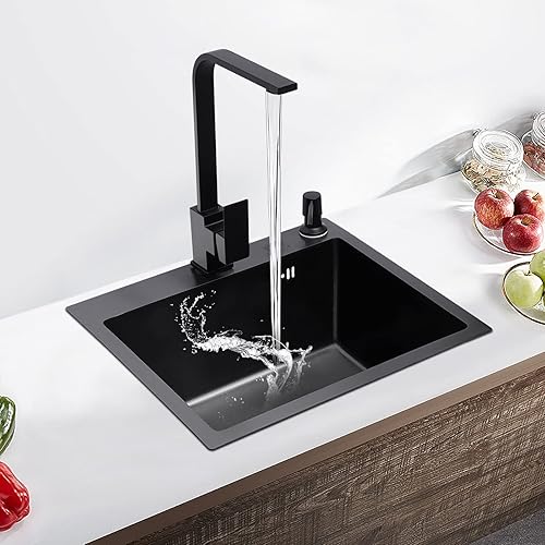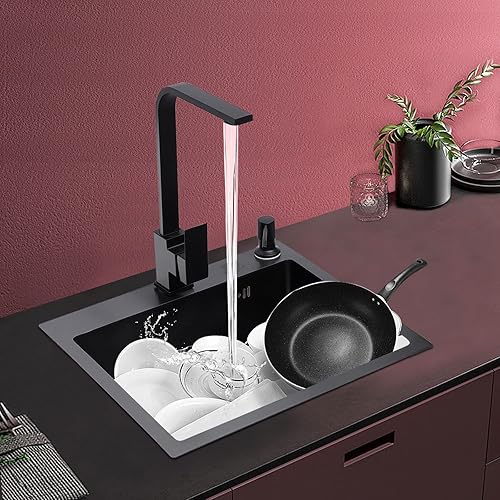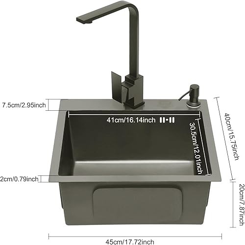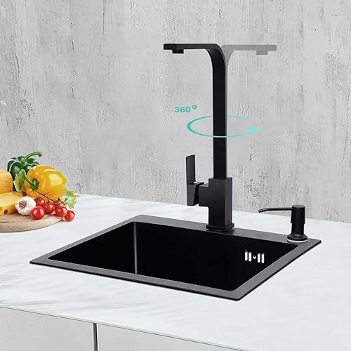 Spüle Spülbecken Edelstahl mit Armatur Schwarz 40 x 45 cm, Einbauspüle Küchenspüle Granitspüle für 45 cm Unterschrank, inkl. Küchenarmatur 360° drehbar, Seifenspender, Über- u. Ablaufgarnitur