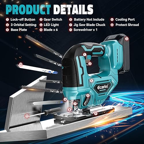 Ecarke Akku Stichsäge 750W für Makita 18V Lithium-Akku mit Arretierung und stufenlosem Geschwindigkeitsschalter, Schneller Blattwechsel für Holz, PVC, Sperrholz und Metall(Batterien nicht enthalten)