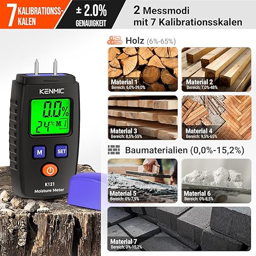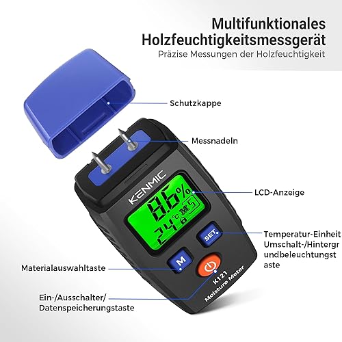 KENMIC Tragbarer Holzfeuchtigkeitsmesser mit LCD und Grünem Licht, Pin-Typ Wasserdetektor, 5 Modi für Wände, Holz, Brennholz, Lumber, Ziegel, Boden