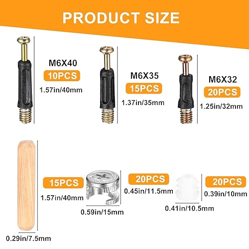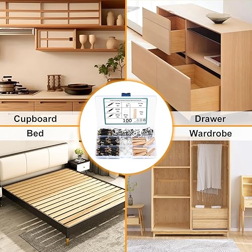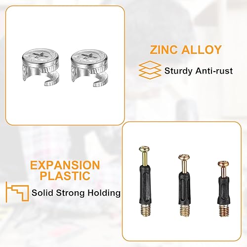 QJKEJI 100 Stk Exzenter Möbelverbinder Schrankverbinder, inkl Excenterbeschläge Einschraubdübel, Kunststoffmuttern, Nockenbeschlag, Holzdübel, Befestigungsschrauben Set für Möbel Kabinett.