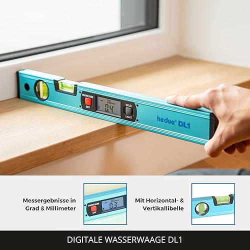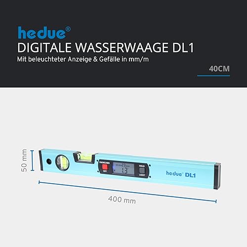 hedue® Digitale Wasserwaage DL1 - Wasserwaage 40 cm mit beleuchtetem LCD-Display, Neigungsmesser digital für Absolut- & Relativmessungen