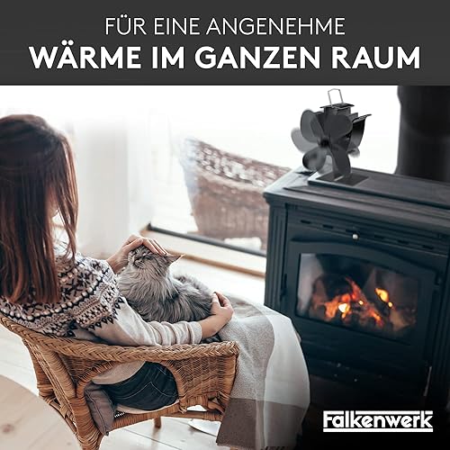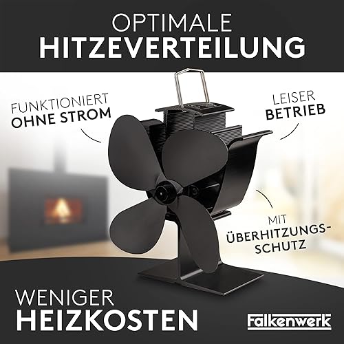 FALKENWERK Ofenventilator ohne Strom - Leiser Kaminventilator mit 4 Blättern - Effizienter & Wärmebetriebener Ventilator für Kaminofen - Ofen Ventilator zur Wärmeverteilung + Handschuh & Thermometer
