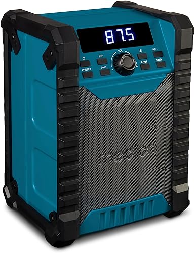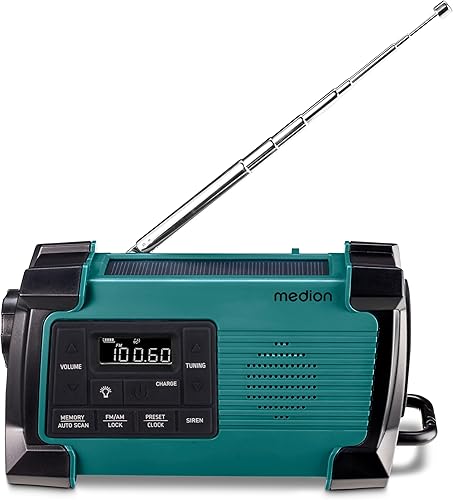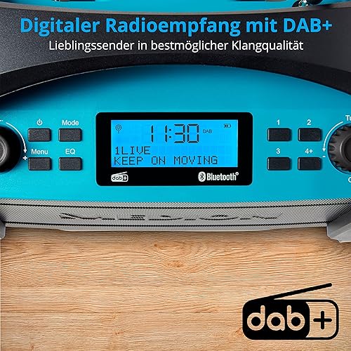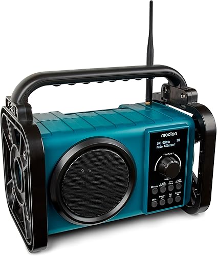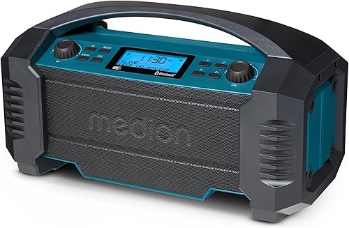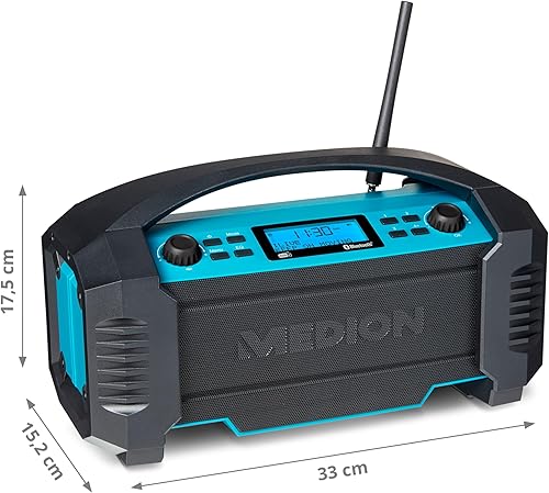 MEDION E66877 DAB+ Baustellenradio (Robustes Gehäuse, Spritzwassergeschützt (IP44), Bluetooth 5.0, PLL UKW Radio, LED-Arbeitslicht, Akku- und Netzbetrieb) blau