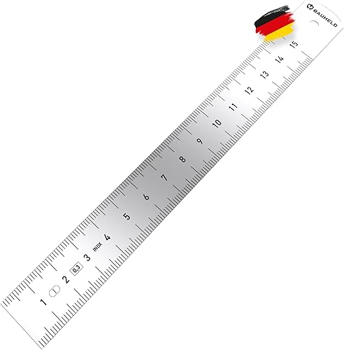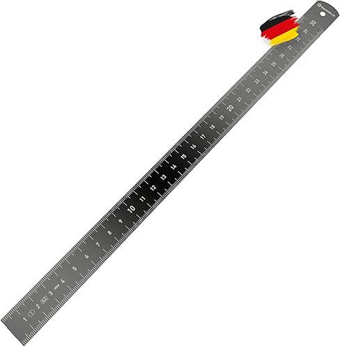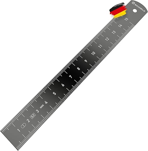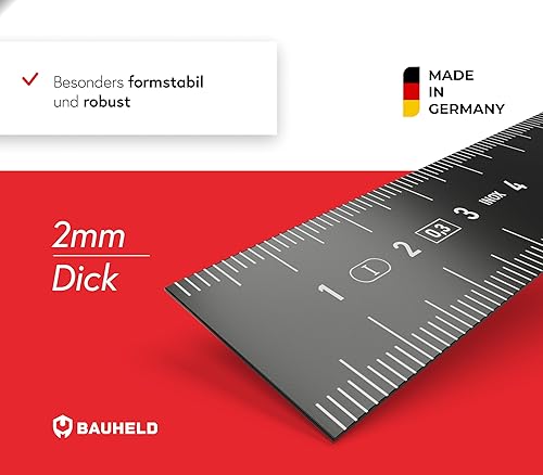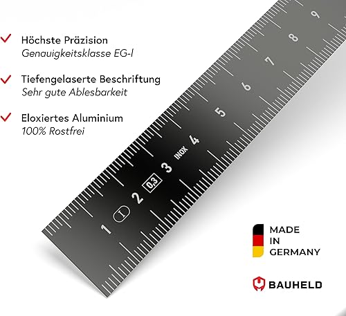 BAUHELD® Stahllineal 300mm [EG-1] - Stahlmaßstab mit Messskala in INCH und CM [Made in Germany] - Robustes Metall-Lineal aus rostfreiem INOX Edelstahl - 30 cm Linial mit praktischer Aufhängelochung
