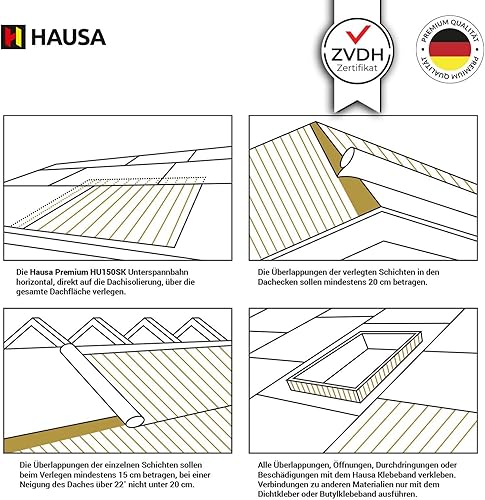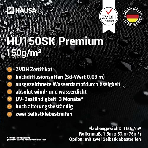HAUSA Unterspannbahn Premium HU150 mit ZVDH-Zertifikat UDB-A, USB-A 150g/m² Dachfolie ohne Klebestreifen 37,5m² hochdiffusionsoffen Sd-Wert 0,03 m, wasserdicht, witterungs- alterungsbeständig
