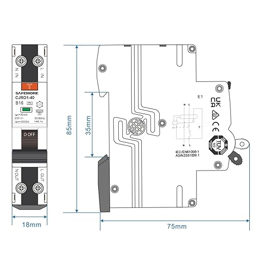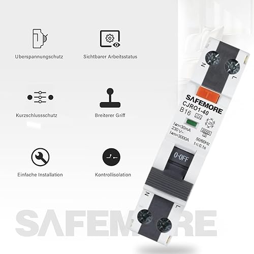 FI/LS-Schalter, 30mA Fehlerstromschutzschalter, 1P+N 6kA FI-Schalter mit RCBO 16Amp Nennstrom RCD-geschützter Leistungsschalter, 230V, Typ A, DIN-Schienen-Montage, Kurve C