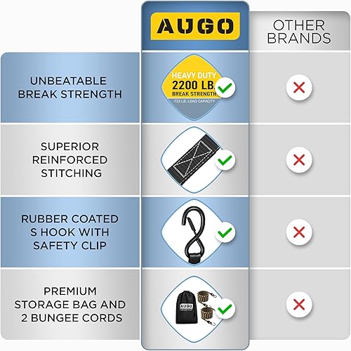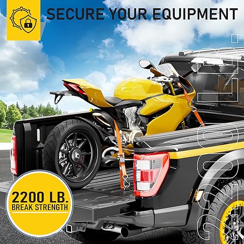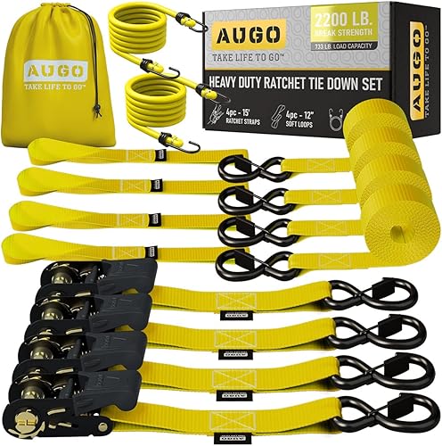 AUGO Spanngurte mit Ratsche – 4 Stück – 4,5 m–1000 kg Tragkraft – Lastengurte für bewegliche Geräte, Rasenausrüstung, Motorrad – Bonus 2 Spanngummis, 4 weiche Schlaufen Spanngurt, Aufbewahrungstasche
