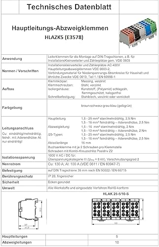 Hauptleitungs Abzweigklemme 5 polig für Hutschiene - VDE GEPRÜFT & MADE IN GERMANY - Strom Verteiler HLAZK5