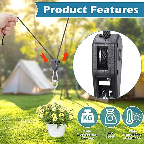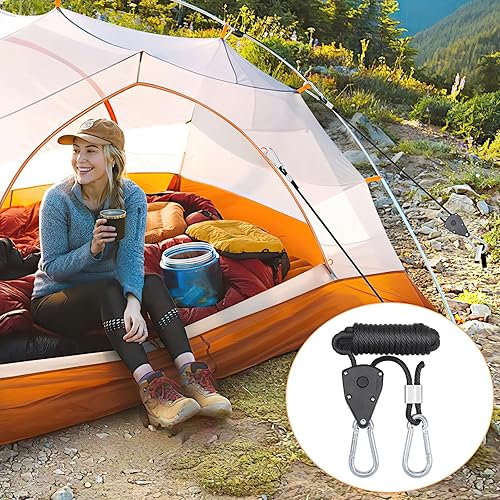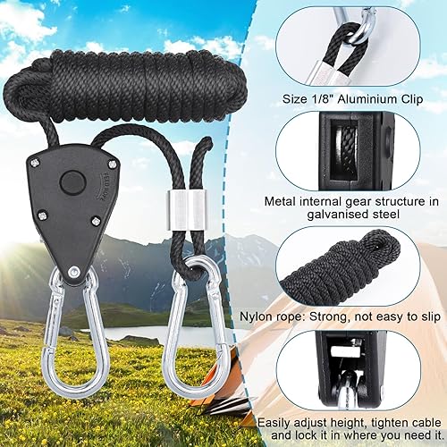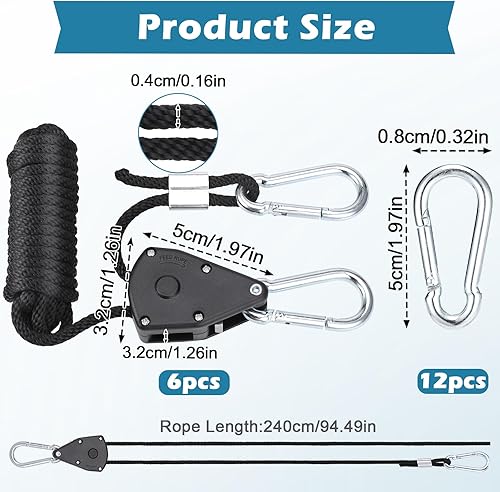 Hejo 6 Stück Ratchet Hangers, 1/8 Zoll Seilratsche mit Haken, 2,4 m Verstellbare Seilzugratsche für Sonnensegel Seilspanner, Windfestes Seil für Camping, Licht, Zimmerpflanzen (Schwarz)