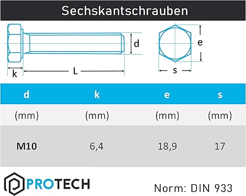 PROTECH 10 Stück Sechskantschrauben M10 Edelstahl M10x55 Gewindeschrauben rostfreier A2 Vollgewindeschrauben Sechskant Schraube V2A DIN933