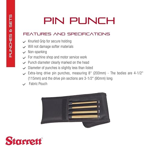 Starrett SB248Z Verlängerter Messing-Antriebsstiftstempel 4-teiliges Set, 3/16'-3/8' Stiftdurchmesser, 8' Gesamtlänge, 3-1/2' Stiftlänge, in Stofftasche