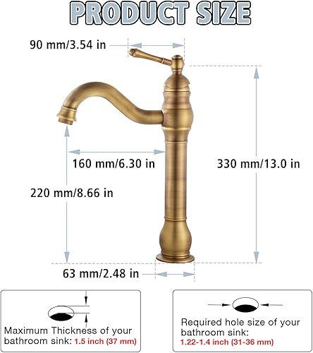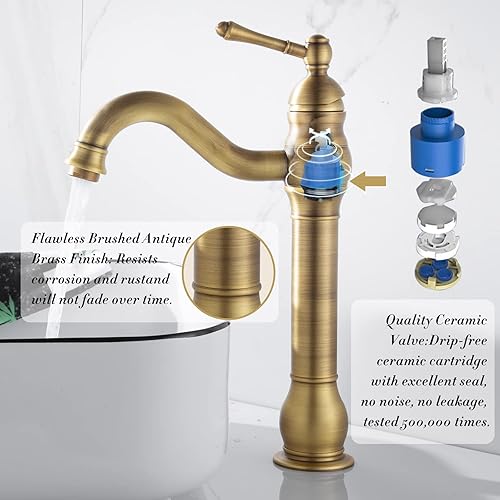 ROWINNAO Wasserhahn Bad Hoch Antikes Messing, Retro Gold Waschtischarmatur Hoch, 360° Schwenkbar Einhebel Mischbatterie Antik Badarmatur Waschbecken Badezimmer, Kaltes und Heißes Wasser Vorhanden