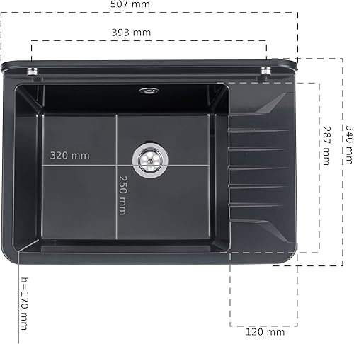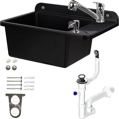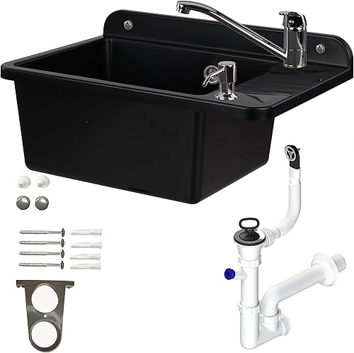 Waschbecken Ausgussbecken 51 cm Weiß Granit Polystyrol Haushaltsspülbecken Spüle mit beweglich Armatur Spülbecken Waschtrog mit Überlauf Seifenspender Siphon wandausgussbecken