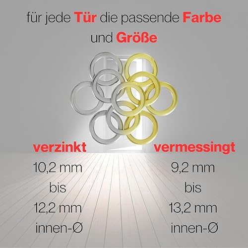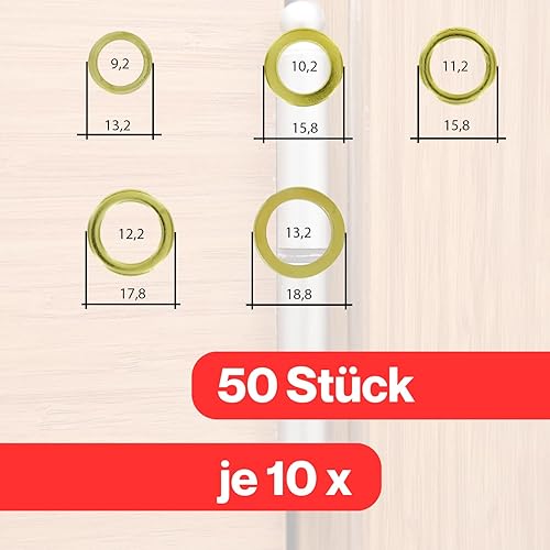 50-teiliges Fitschenring-Sortiment, je 10 x Ø 9/10/11/12/13 mm, zum Anheben von Türen, vermessingter Stahl, Unterlegscheiben, Beilagscheiben, Distanzscheiben, Türheber