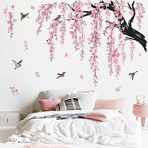 wondever Wandtattoo Kirschblüte Rosa Baum Ast Groß Wandaufkleber Hängende Blumen Blüten Vögel Wandsticker Wanddeko für Wohnzimmer Schlafzimmer Sofa Hintergrund