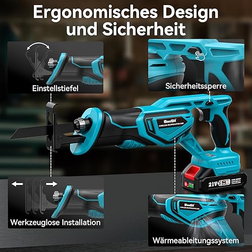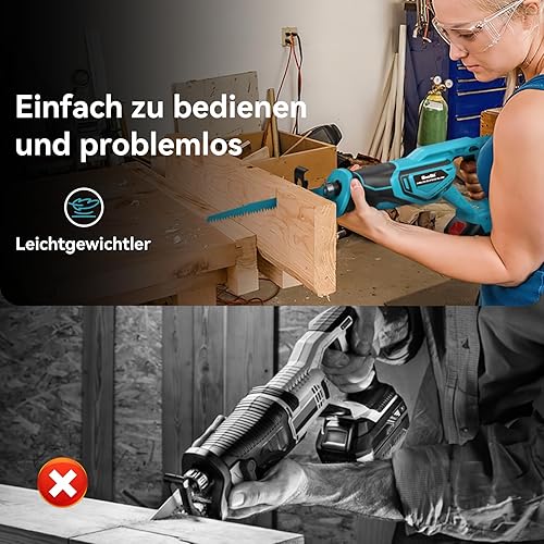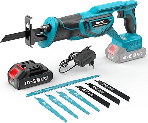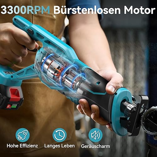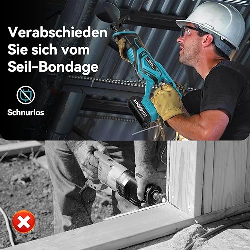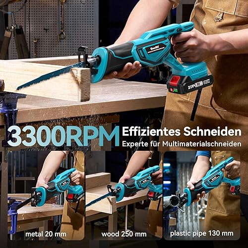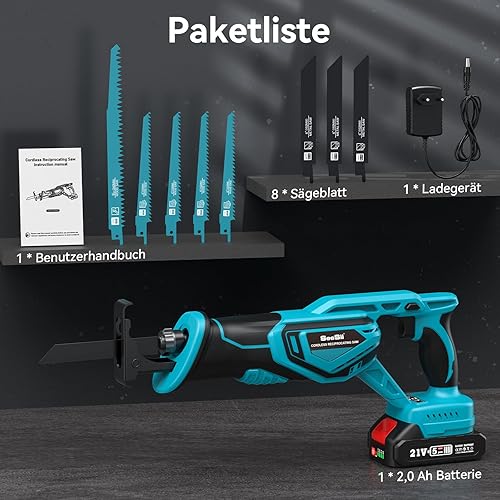 Akku-Säbelsäge/Reciprosäge, Akku-Säbelsäge mit 21V 2000mAh Batterien Werkzeugloser Klingenwechsel 8 Stück Säbelsägeblatt Set, 3300 U/min Säbelsäge for Holz, Plastik und Metallschneiden