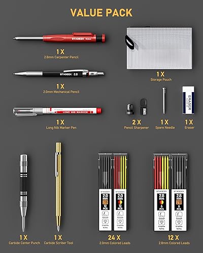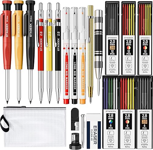 STAGEEK 22er-Set Mechanischer Zimmermannsbleistifte, Automatischem Körner, Hartmetall-Anreißwerkzeug, Radiergummi und Markierstift für tiefe Löcher, Robuster Konstruktionsbleistift für Architekten