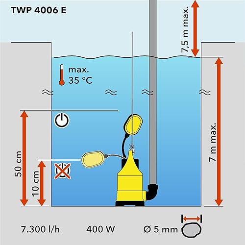 TROTEC Tauchpumpe TWP 4006 E – Pumpe für Klarwasser – Fördermenge 7300 l/h, Eintauchtiefe max. 7 m, Rückflussstopp, IP8X