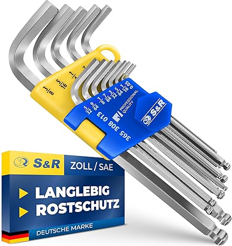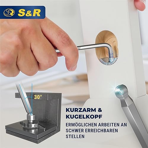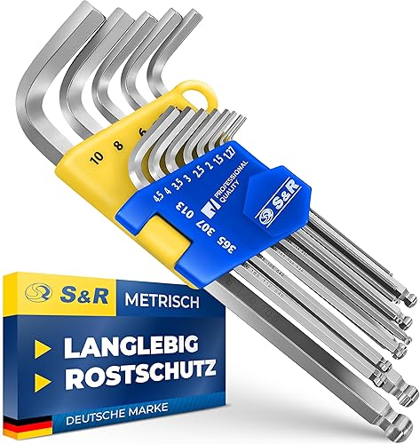 S&R Innensechskantschlüssel Satz HX, 13-tlg mit Kugelkopf, Innensechskant LANG, 1,27 bis 10 mm, Cr-V-Stahl gehärtet, Winkelschlüssel rostfrei, Sechskant Schlüssel-Set in stabilem Klapp-Halter