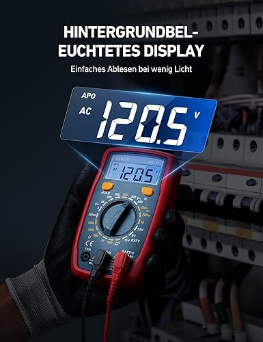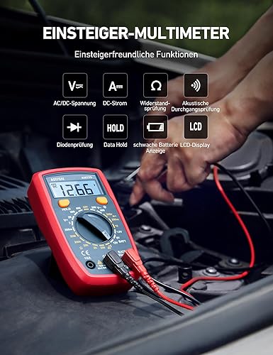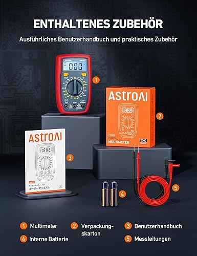 AstroAI Digital Multimeter mit Ohm Volt Ampere Spannung Tester Messung von AC/DC Spannung, DC Strom, Widerstand, Diode, Kontinuität Messinstrument mit Hintergrundbeleuchtung, Tiefrot