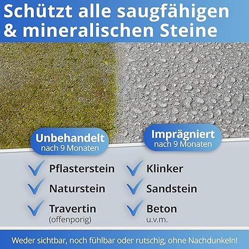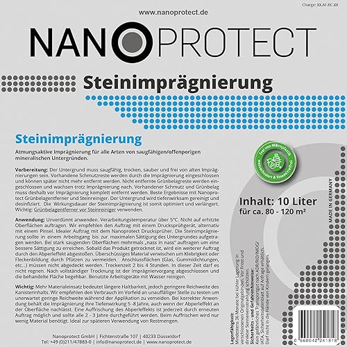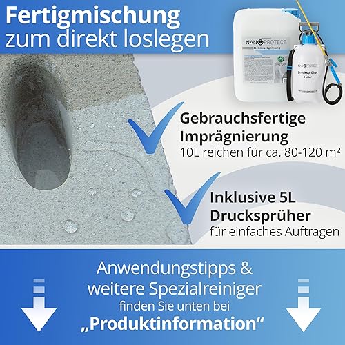Nanoprotect Steinimprägnierung inkl. Drucksprüher | 10 L für ca. 80 – 120 m² | Vorbeugend gegen Grünbelag und Schmutz | Ideal für Pflastersteine, Beton und Naturstein