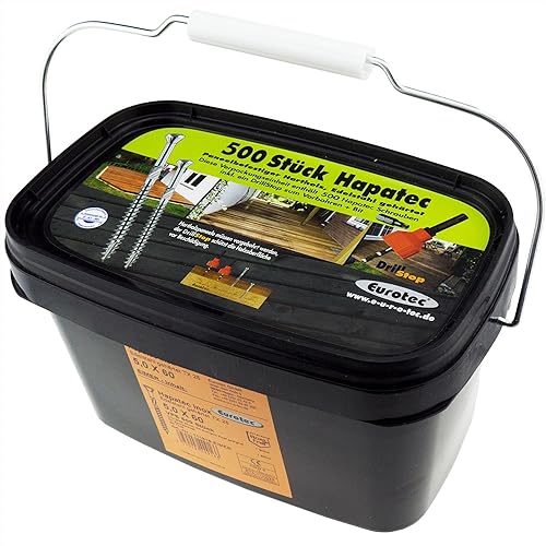 500 Stück 5x70 Hapatec Terrassenschrauben Verlegeset, incl. 1 x TX 25 Edelstahl-Bit und 1 x Senkbohrer mit Anschlag, martensitischer Edelstahl gehärtet, Hartholzschraube mit Zulassung
