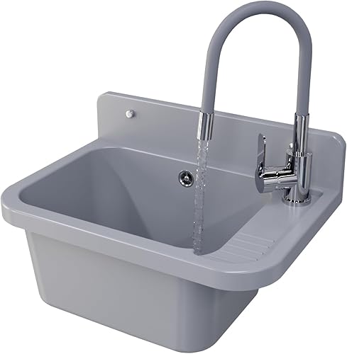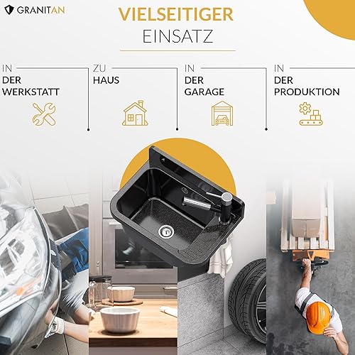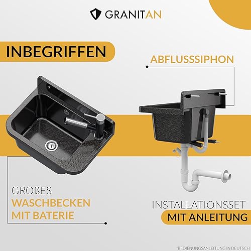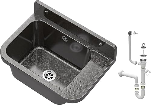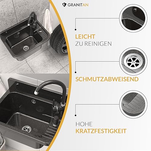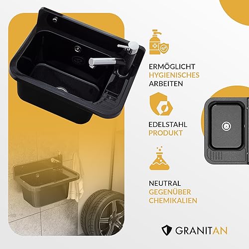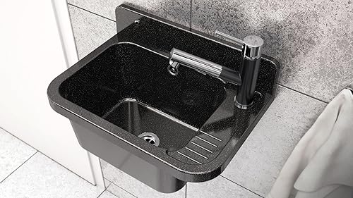 Granitan Ausgussbecken für Garage Keller Werkstatt und Waschküche - Universal Waschtrog Set mit Siphon - Waschbecken mit Abtropfschale Wandmontage aus Polypropylen - 50x34x31 cm - Schwarz - Figo