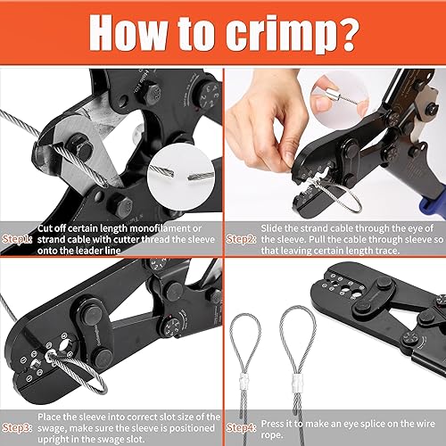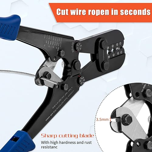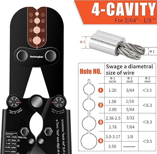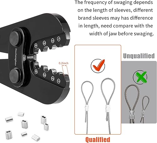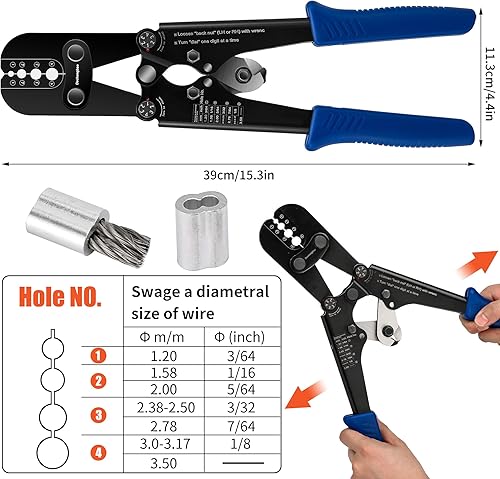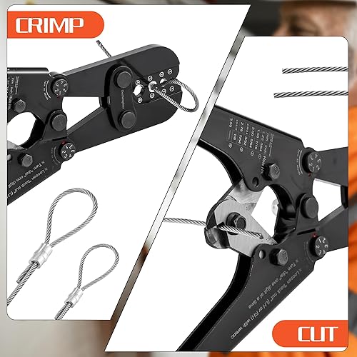 Presswerkzeug, Drahtseil-Crimpwerkzeuge für Aluminium-Kupfer-Duplex-Sanduhrhülsen, Stoppknöpfe und Aderendhülsen mit integriertem Kabelschneider. Funktioniert von 3/64 Zoll bis 1/8 Zoll