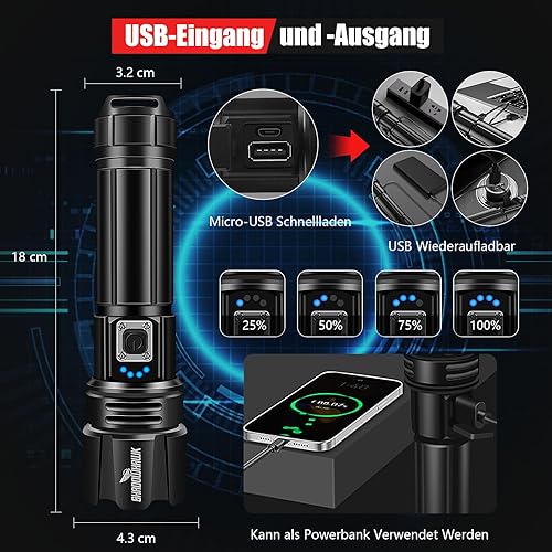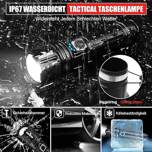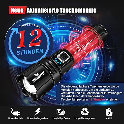 Shadowhawk Taschenlampe Led 500000 Lumen, Extrem Hell Taschenlampe USB Aufladbar Taktische Taschenlampen Mit holster XHP70.2, IP67 Wasserdicht 5 Lichtmodi für Camping Wandern Notfälle