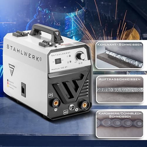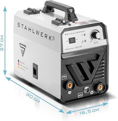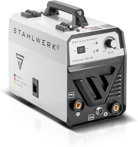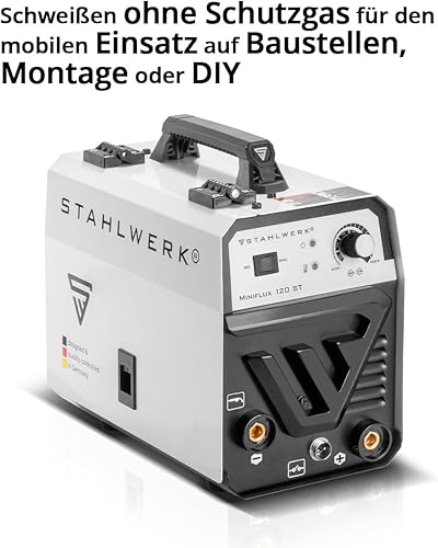 STAHLWERK Mini FLUX 120 ST Fülldraht Schweißgerät mit synergischem Drahtvorschub für 0,6 | 0,8 | 0,9 | 1,0 mm Schweißdraht, kompakter Inverter mit echten 120 Ampere zum Schweißen ohne Schutzgas