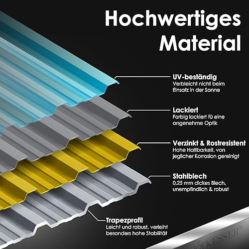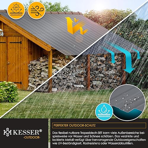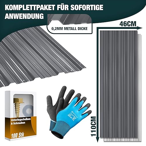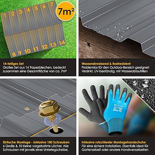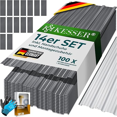 KESSER® 14x Profilblech Trapezblech 110cm x 46cm = 7 m² - Dachblech für Gerätehaus, Dachplatten Verzinkter Stahl 0,25mm, inkl. 100 Schrauben + Unterlegescheiben & Montagehandschuhe, Anthrazit