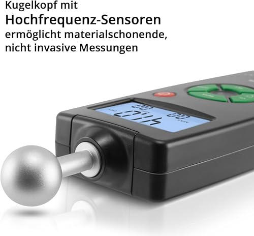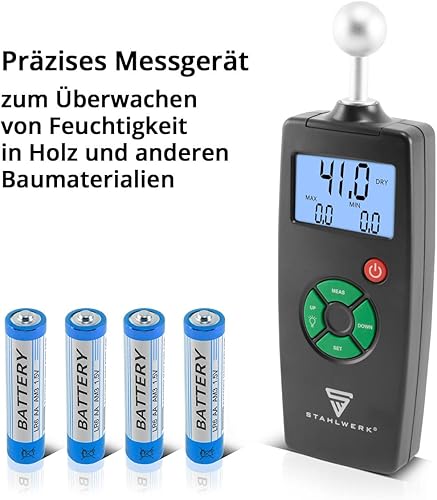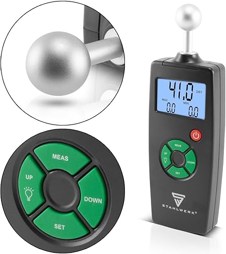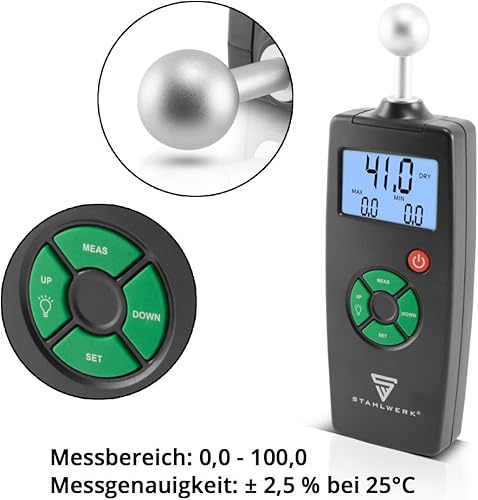 STAHLWERK FM-100 ST Profi Feuchtigkeitsmessgerät mit 40 mm Messtiefe und Kugelkopf, präziser Feuchtigkeitsmesser/Feuchtemesser für Wände, Holz, Putz, Gips und Zement
