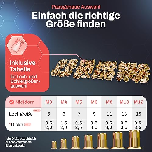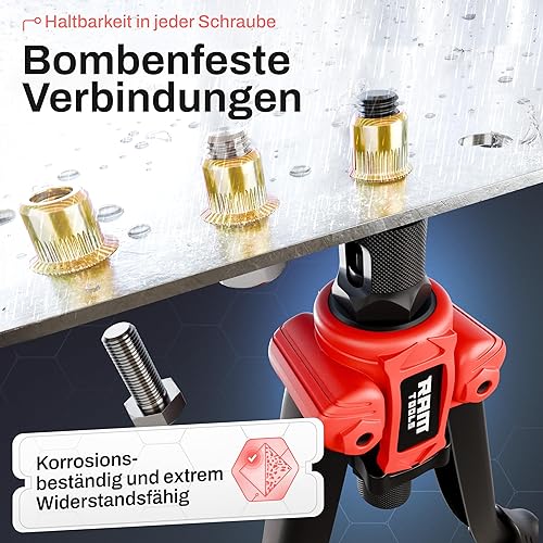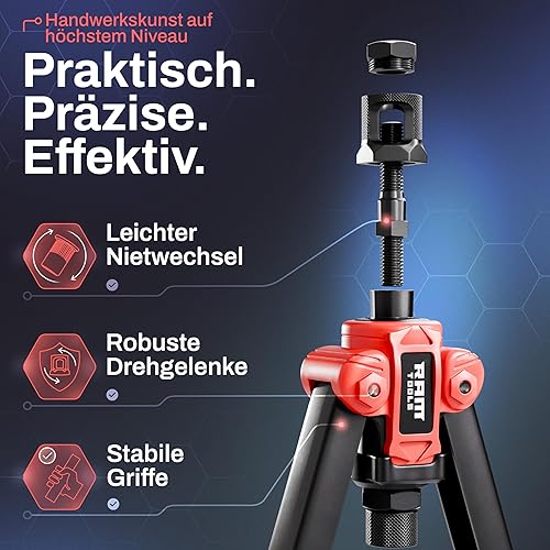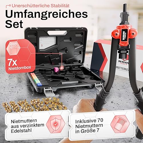 RAM TOOLS® Nietmutternzange, Nietzange Set inkl. 70 Nietmuttern, MIT Bohrloch/-größentabelle, Dorne in M3 M4 M5 M6 M8 M10 M12, Profi Blindnietmutternzange